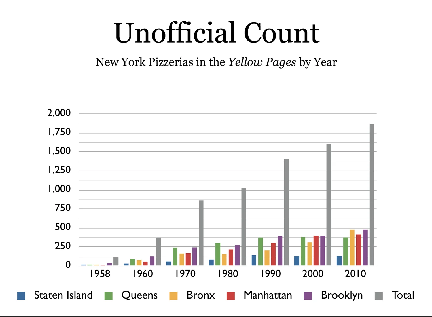 I went page by page through Yellow Pages books from each of the five boroughs. I counted every pizzeria listed under "Pizza" but avoided double counting any same-named listings at the same address.