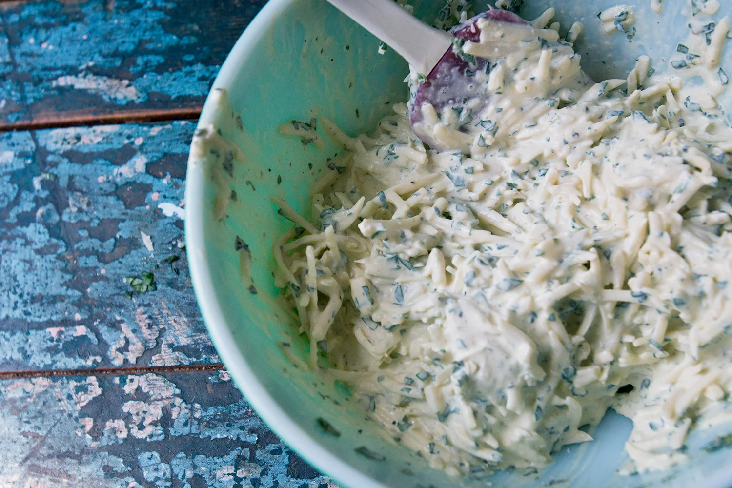 4 Combine cheese, cream, basil, salt, and pepper in a bowl. You don’t need to follow exact measurements: pour the cream in last, and when it begins to pool through the bottommost shreds of cheese, stop pouring (see above photo).