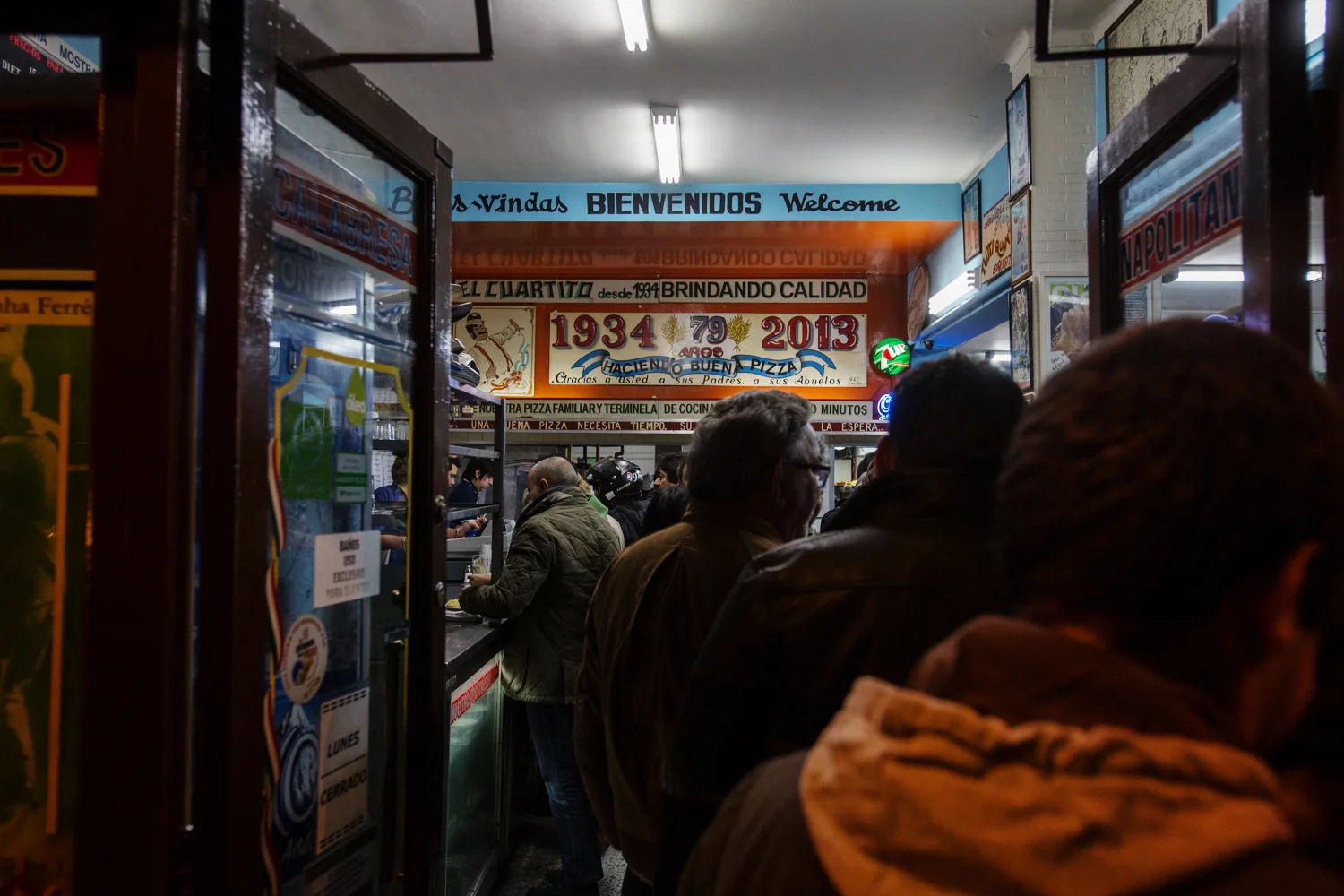 The size of the crowd waiting outside and inside, the packed tables in two big dining rooms and the sea of pictures on the walls, the words, “Desde 1934,” painted above the pizza counter, the way everyone in the place applauded loudly at the sound of a shattering glass or plate: all of this stuff—and the pizza itself—led to my immediate realization that El Cuartito is a totally legit pizzeria. Imagine Katz’s Deli in New York if you can, but change English to Spanish, turn pastrami into pizza, and make most everyone Argentine—and voilà: El Cuartito. Thank you, Alejandra and Walter!